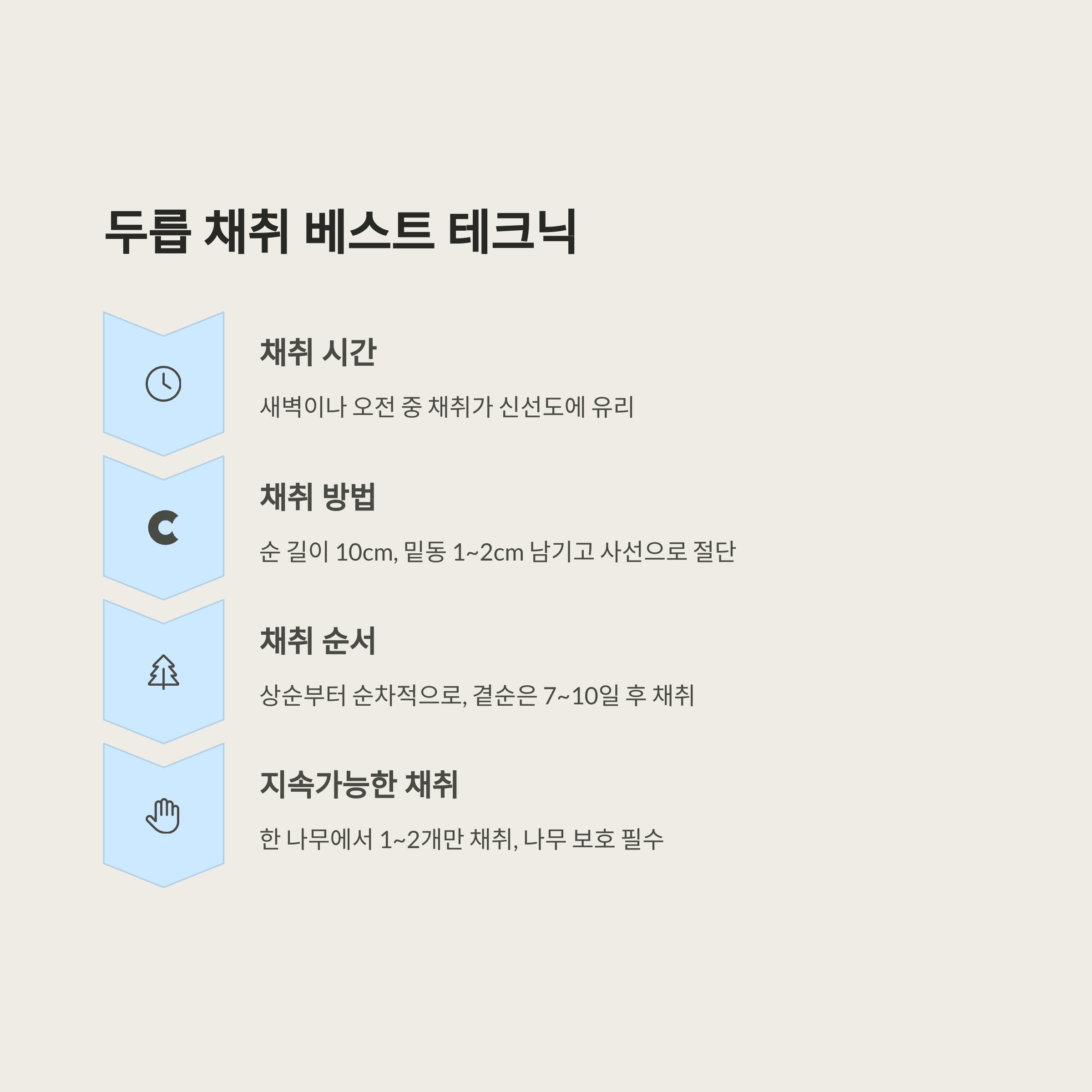 두릅 채취방법은 생각보다 간단하지만, 몇 가지 주의사항과 요령이 있습니다. 단계별로 알아봅시다.