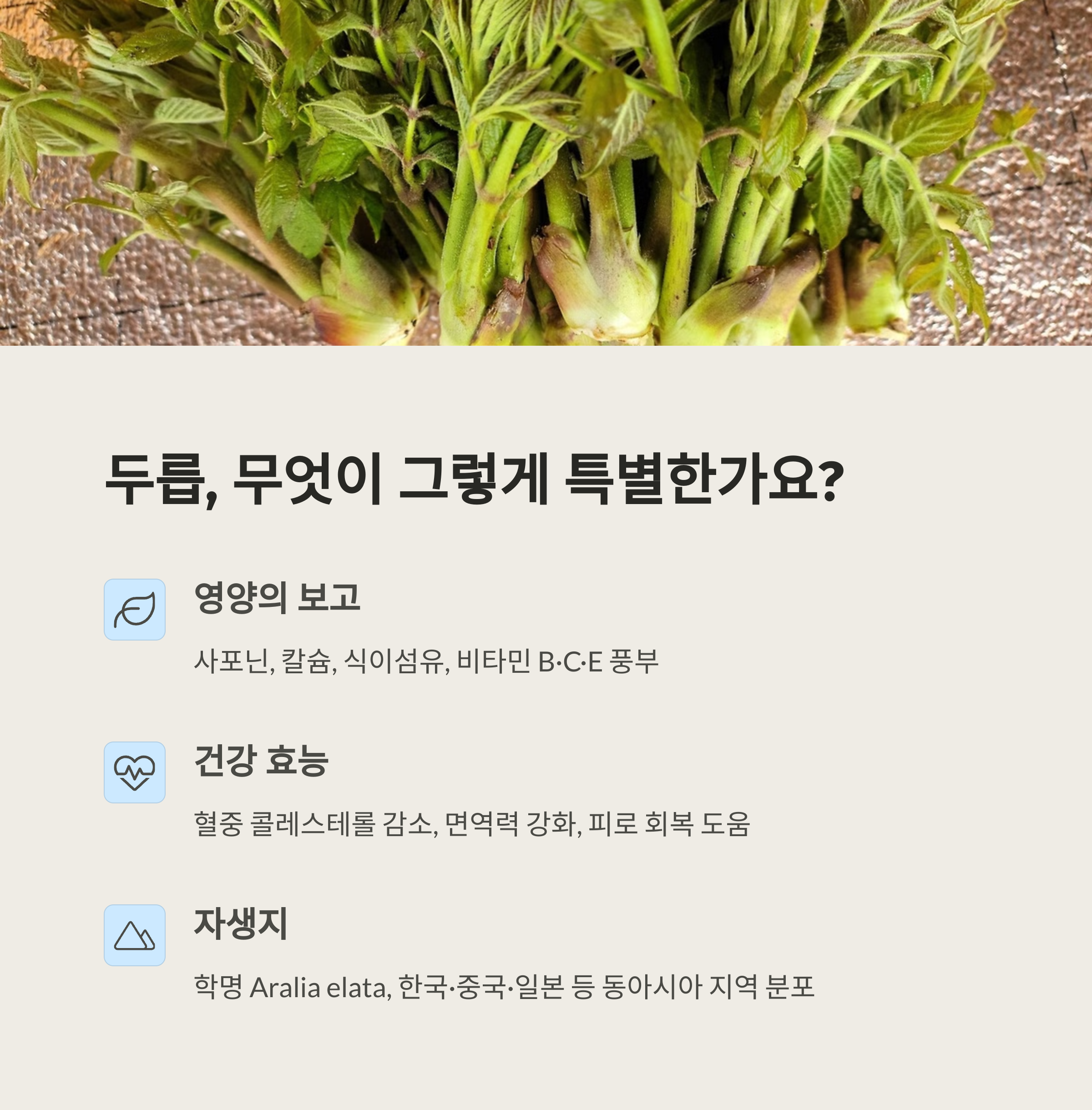한국농촌경제연구원에 따르면, 두릅에는 항산화 물질이 풍부하여 면역력 강화와 피로 회복에 도움을 준다고 합니다. 특히 쌉싸름한 맛의 원인인 사포닌은 혈관 건강에 좋은 것으로 알려져 있습니다.